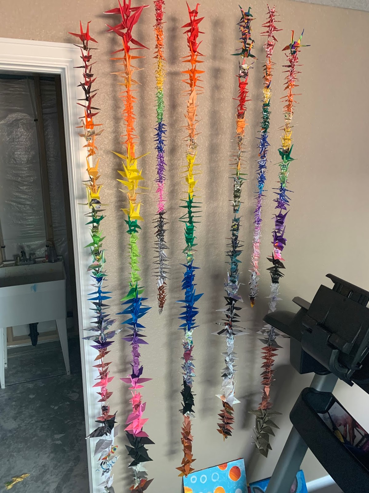 For those of you who have been checking my blog since the beginning of remote learning, I appreciate you so much! Thank you. You also know that I started working on folding 1000 paper cranes. So far I have 700 strung. Each strand in the picture below is 100 cranes.